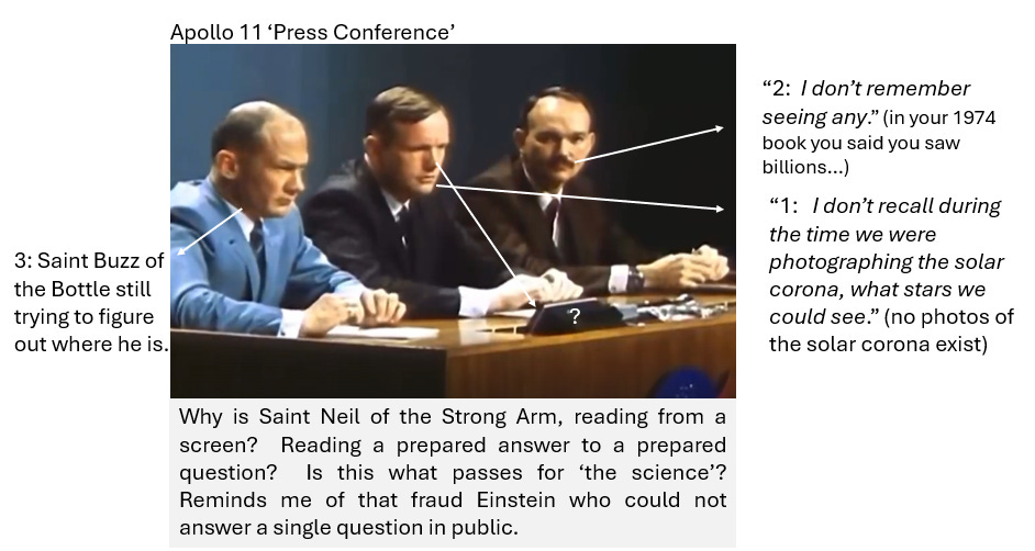 The legerdemain of the flight itself is easily identified in almost innumerable areas. As with Gagarin, the Apostles of Apollo 11 could not answer the simplest questions. Did you see stars Neil of the Strong-Arm? ‘I don’t recall’ replies Saint Neil looking at the black curtains. Of course you don’t remember anything Saint Neil because quite logically, using ‘the science’, you never went anywhere.