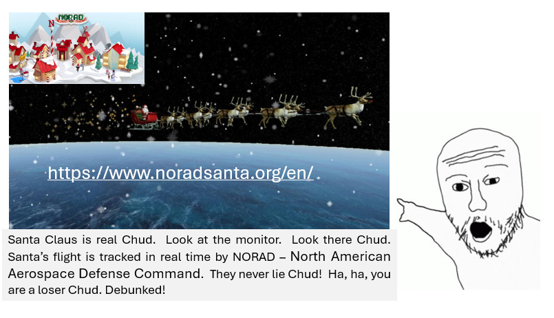 ‘Tracking’ an object from a simulator does not prove much. I can build a simulator, run a program to have Santa journey across the globe, and send the results to a front end presentation layer for you to view (build your own flight tracker, use AI to fake ‘actual flights’). I can then point to the simulation on the screen, or to the UI rendering of my code and say, ‘I told you Santa Claus exists he is flying over Norway, look at the monitor loser!’ You won’t have a clue it is a fraud (children and by extension, fanboys who have the mentality of children, will believe).