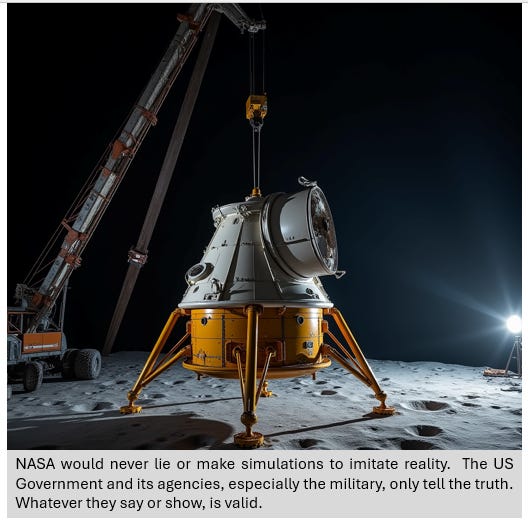 Their only recourse is CGI-AI-simulations. These will be easily ripped apart. Every year NASA promises a lunar return. They have committed to February (now) April 2026, when they supposedly do a moon fly-by over 10 days, some 54 years after the last ‘lunar landing’. Given the billions spent on simulation it might be realistic, but it will still be revealed for what it is.