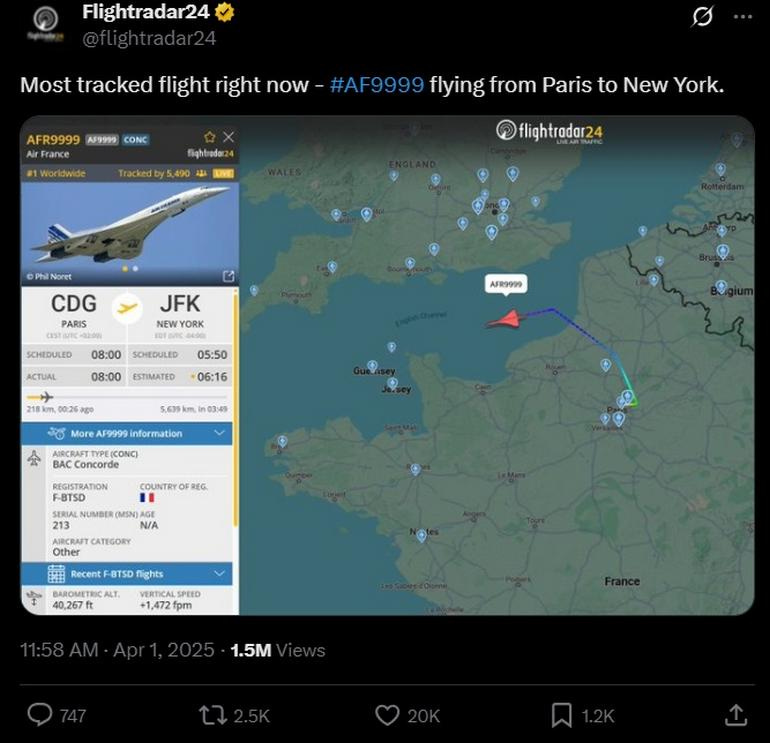 [April 2, 2025: Thousands of flight enthusiasts excitedly tracked a Concorde flying from New York to Paris. Until they realized Flight Radar had got the better of them. Whoopsie.]